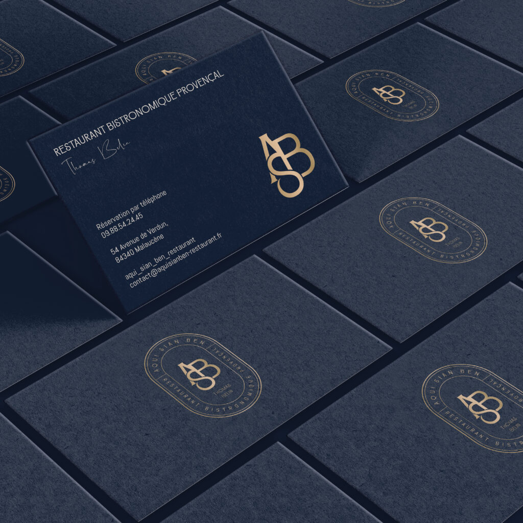 J’ai accompagné Thomas Belin dans le développement de sa stratégie de marque visuelle. Il m’a confié la création de son logo et de son identité visuelle, déclinée sur ses cartes de visite ainsi que sur une cuvée de vin appartenant à Aqui Sian Ben.